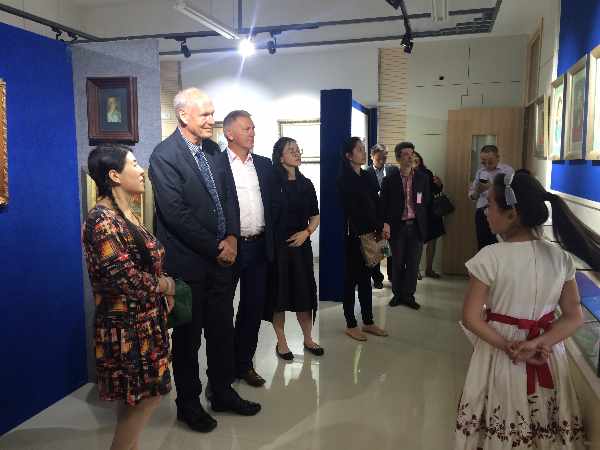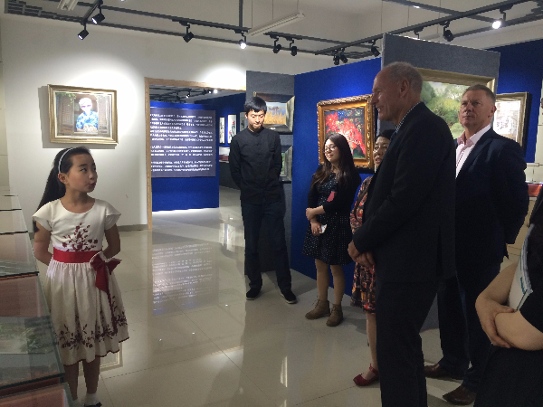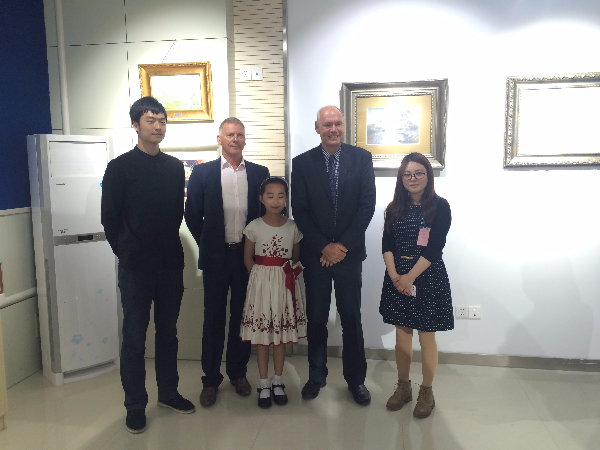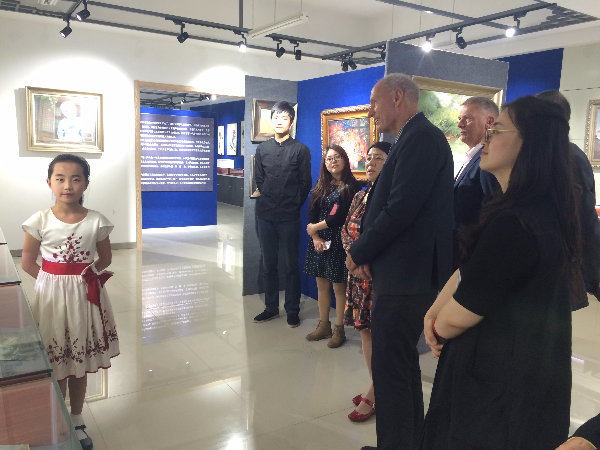几位外宾在华锐教育集团博物馆馆长陆瑞兴等老师的陪同下参观美术馆,并由华锐实验小学三年级2班的于子萱同学为两位客人进行展品讲解。卡特先生高度赞扬了华锐实验小学学生的优秀表现,并一起合影留念。