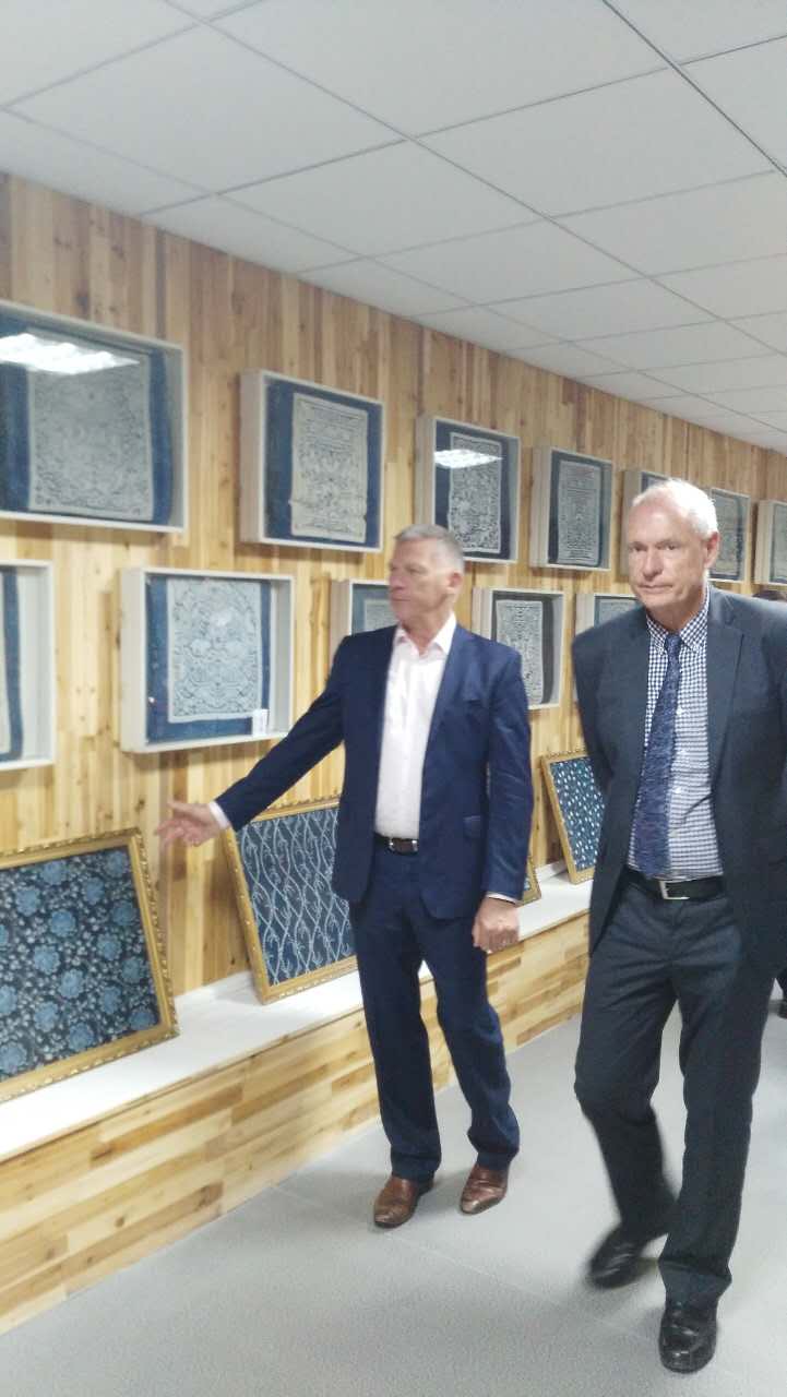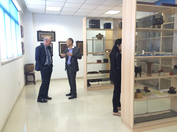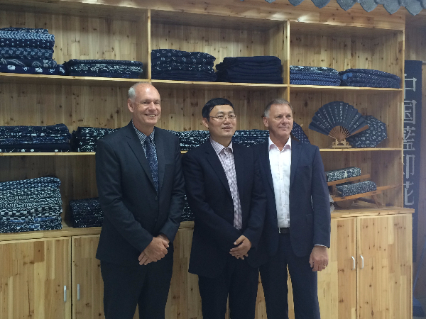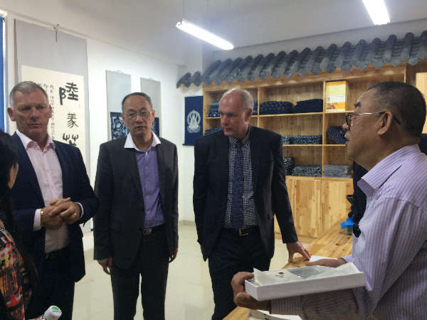 4月15日中新教育交流活动结束后,新西兰两位外宾联合国高级顾问、新西兰前教育部长卡特先生(Christopher Carter)和奥克兰缇瑞莫阿娜小学校长凯撒先生(Peter Kaiser)及新西兰奥克兰国际学院校长朱肇新参观了华锐教育集团蓝印花布博物馆、美术馆、民俗馆及影视中心。