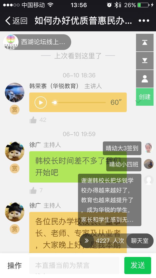 6月10日晚八点,华锐教育集团董事长韩荣寨做客西湖论坛线上分论坛千聊直播平台,为大家介绍了国家民办教育现状和华锐教育“普惠优质”办学新模式。当晚有超过4227人参与直播,创西湖论坛线上分论坛直播人数最高记录。