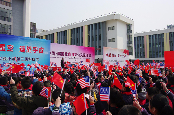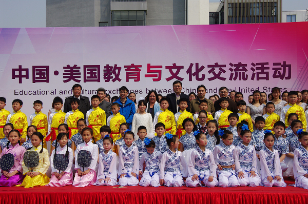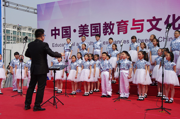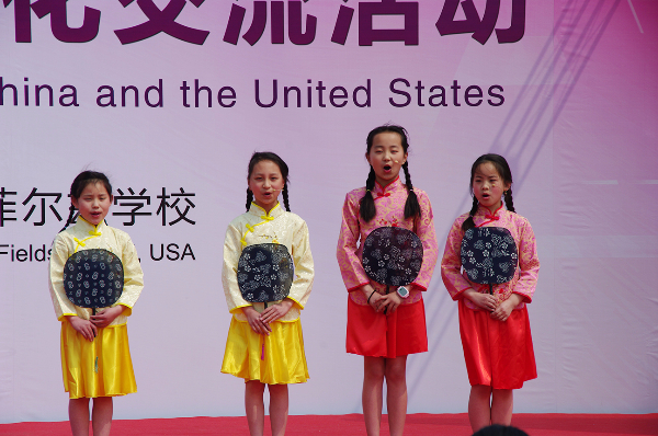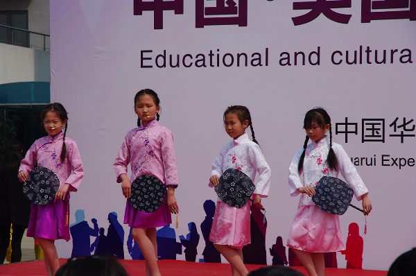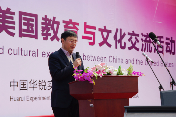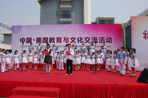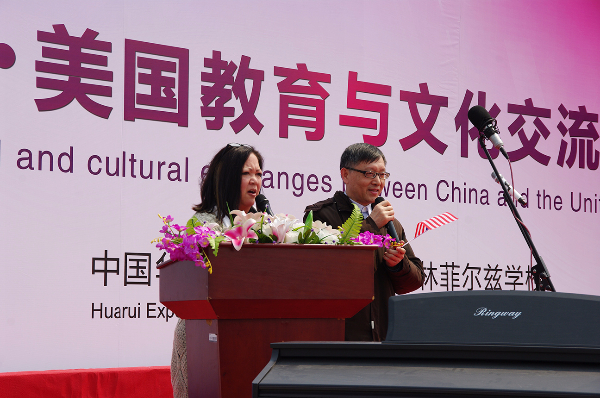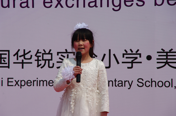 演出开始前首先由华锐教育董事长韩荣寨为全校师生和家长介绍美国来宾,并介绍了华锐教育近年来各项国际教育与文化交流情况。其次贝吉•考迪尔女士上台讲话,对本次参观华锐教育集团旗下各单位予以感谢,并对华锐教育集团的办学理念和教育模式给予高度肯定,表示在培养孩子、创新教育等方面有许多可以学习和借鉴的地方。