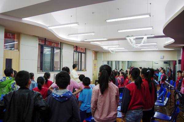华锐之声少儿合唱团的同学们为张老师表演了两首歌曲,包括一首全英文曲目,抑扬顿挫的歌声悠扬,高声部和低声部交相辉映,听到同学们从组织到训练仅仅过了三个月就能唱到如此程度,张老师忍不住为同学们竖起了大拇指,希望同学们努力练习,在将来一定能够唱的更好。