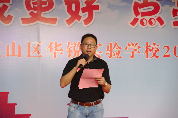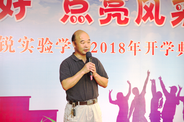 无锡市语文名师、原江南中学副校长、现华锐实验学校副校长沈伟首先向同学们和家长致辞。沈校长看到同学们青春洋溢的精神面貌十分开心,希望同学们长风破浪会有时,直挂云帆济沧海。进入初中之后设立人生目标继续努力学习,回报父母回报社会。