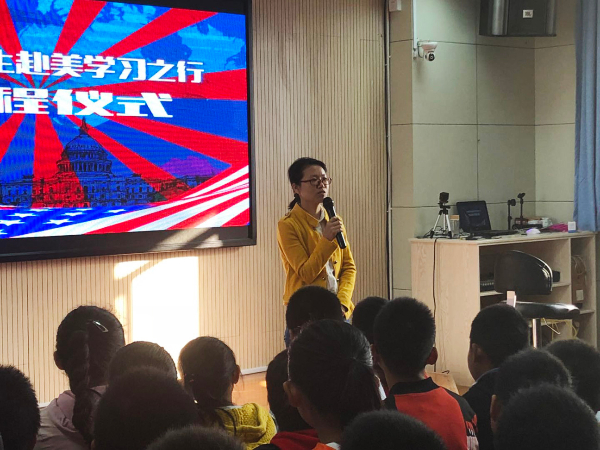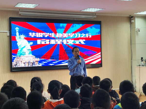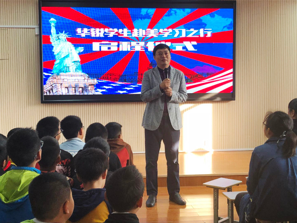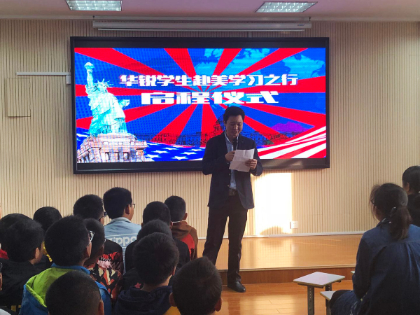 2018年10月12日,华锐实验学校初中部为前往美国学习的两位学生代表耿墨、刘天一举行了启程仪式。