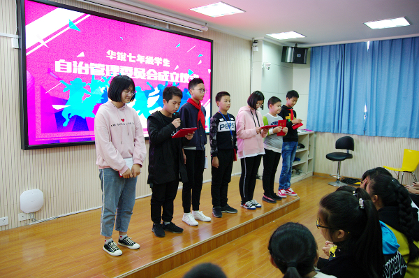 2018年10月29日,华锐实验学校初中部举行了学校自治管理委员会成立仪式,宣布初中自治管理委员会(以下简称“自委会”)正式成立,并公布了担任自委会主席、副主席、自理部长、自律部长、自护部长、自学部长、自强部长等七个岗位的学生人选。