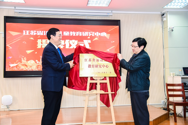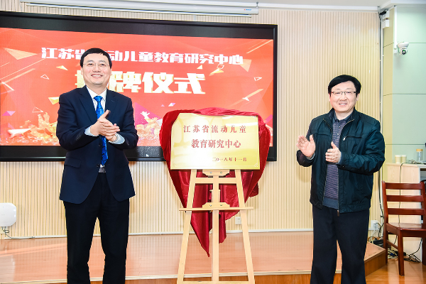 会议接下来由全国小学语文名师、江苏省特级教师诸向阳及华锐教育集团董事长韩荣寨共同为江苏省流动儿童教育研究中心成立举行揭牌仪式。