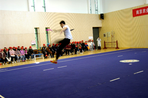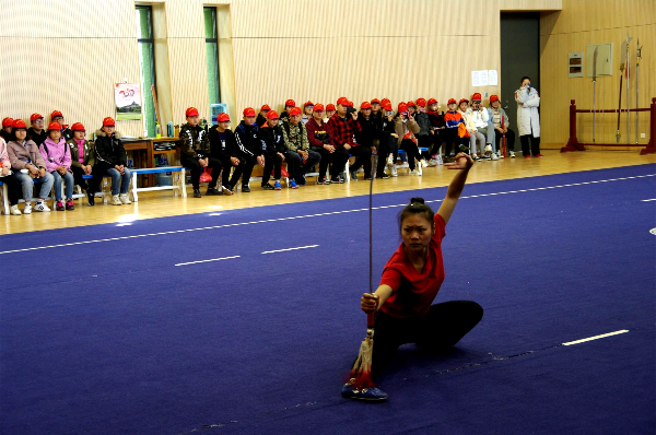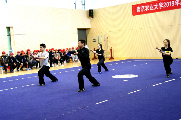 在农大体育馆,学生们现场观摩了达到省级水平的武术训练,大学生运动员表演了刀法、棍法与太极拳,近距离感受到大学生的精神气质。