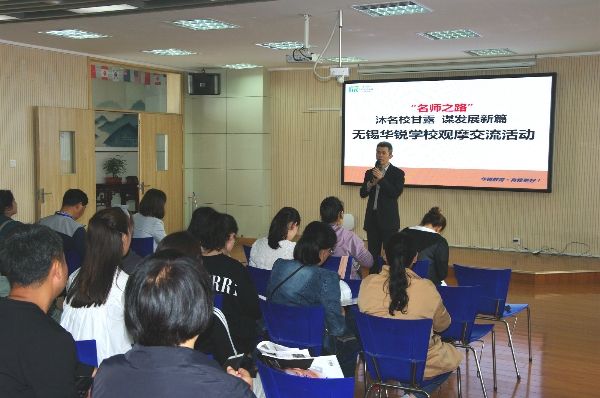 2019年4月23日下午,陕西西安“名师之路”教育代表团一行近百人来到华锐实验学校参观访问。代表团分别参观了华锐影视演艺中心、美术馆、民俗馆和蓝印花布博物馆。对华锐中华优秀传统文化教育、特色办学和为学生提供丰富的优质教育资源给予认可与赞许。参观结束后,华锐实验学校副校长朱斌介绍了华锐的教育理念与取得的成绩,并与大家交流教育心得。
