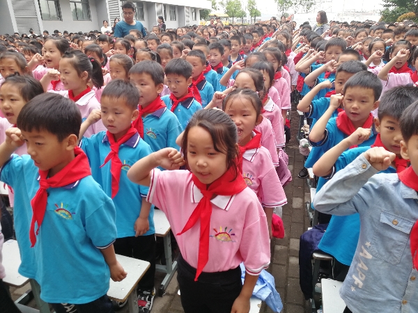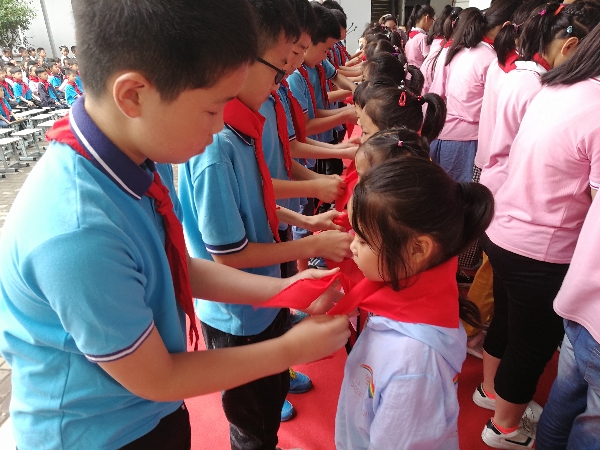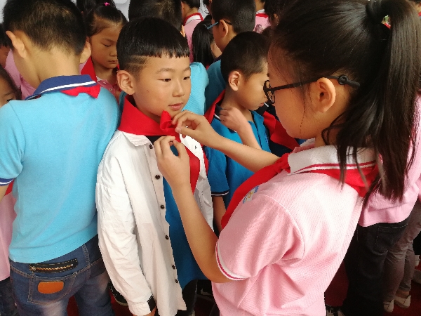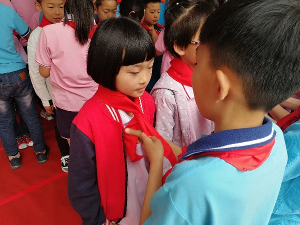 同学们分批上台,由老队员的大哥哥大姐姐们,给他们带上鲜艳的红领巾。