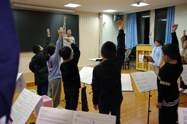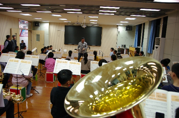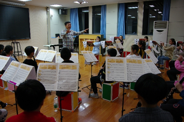 跟张老师一起排练是一件愉快之事,他的幽默语言、灿烂笑容总给人带来快乐,排练气氛很轻松。华锐管乐团的孩子们觉得在张老师的课堂最大的感受,用‘乐在其中’四个字形容最贴切不过。在张老师的排练中,没有任何的拘谨,每人脸上都露出会心的笑容。在这样的气氛里,练习完成速度很快,排练效果显著。课后孩子们都用“太有意思了!”来形容张老师的课,孩子们在轻松愉快的氛围中学习和领悟。“快乐音乐”,让孩子们乐在其中。