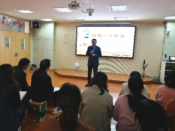 2019年11月12日中午,华锐实验学校党支部开展“不忘初心、牢记使命”主题教育,邀请韩荣寨校长讲述华锐办学的初心故事,全体校(园)级干部和党员老师参加活动。